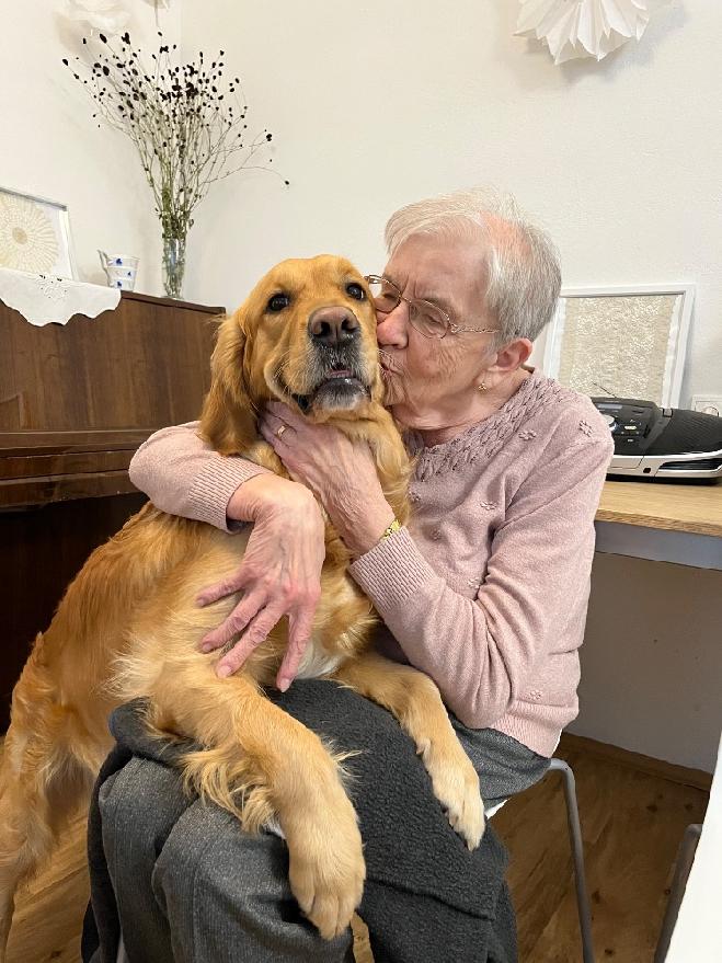 Aisha je zlatý retrívr s asistenčním výcvikem a již od štěňátka navštěvuje nemocnice, domovy seniorů, speciální školky a školy, stacionáře i další zařízení. Díky speciálnímu výcviku dokáže citlivě reagovat na různé situace i potřeby klientů. Canisterapie s Aishou je jedinečná - propojuje odbornost, pohyb a hluboký kontakt s člověkem.